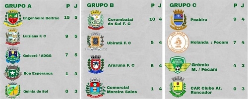 Os dois times de Campo Mourão se enfretam neste domingo (15h30) pela Copa Comcam - Grupo ABL. O Holanda é segundo do grupo C, com 7 pontos, enquanto o Grêmio Mourãoense é terceiro, com 4 e um jogo a menos. A classificação nos três grupos está no quadro acima. Ao todo serão seis jogos da rodada. Confira: