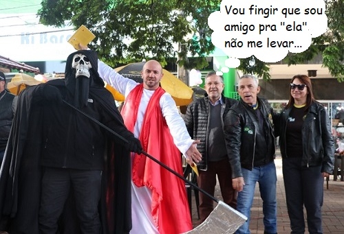 Olha quem apareceu neste sábado na campanha do Maio Amarelo de Campo Mourão: ela, a Morte. Junto um um Anjo, participou de ação de conscientização no trânsito. A blitz contou com encenação, distribuição de panfletos e brindes aos condutores de veículos. O prefeito Tauillo Tezelli fez pose ao lado da morte e do anjo. Toc, toc, toc!...