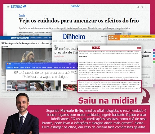 Grandes portais divulgaram matéria sobre os cuidados para amenizar os efeitos do frio. Por grandes portais leia-se Estadão, UOL, Zero Hora, IstoÉ, IstoÉ Dinheiro, Diário do Grande ABC, Bem Paraná, CGN e Jornal de Brasília. Detalhe: todos destacaram o médico oftalmologista Marcelo Brito, de Campo Mourão. Ele falou sobre o cuidado da saúde dos olhos com o aumento de doenças como conjuntivite, alergias e olho seco.