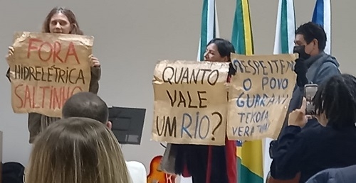 Grupo de ativistas aproveitou sessão solene da Academia Mourãoense de Letras para mostrar cartazes em defesa do povo guarani e meio ambiente, e contra a construção da hidrelétrica Saltinho, na região do Barreiro das Frutas, em Campo Mourão. O evento da AML entregou duas comendas Vida & Liberdade, uma delas para a professora Sinclair Pozza Casemiro, que tem trabalho em defesa de povos indígenas.