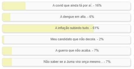 "O que mais te preocupa no momento?" Enquete com esta pergunta foi encerrada neste domingo. A alternativa "A covid que ainda está por aí" ficou em segundo lugar, com 16% dos votos. Em primeiro, disparado, ficou "A inflação subindo tudo". Teve 61% da votação total. O resultado completo está no quadro acima.