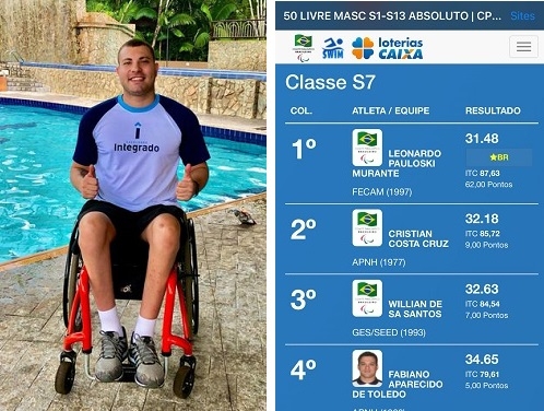 O nadador paraolímpico Leonardo Pauloski Murante, de Campo Mourão, conquistou neste sábado a medalha de ouro mos 50 m no Circuito Caixa de Natação. Mais: bateu o recorde brasileiro da prova. A competição foi disputada em São Paulo, onde ele conquistou outras quatro medalhas -- duas de prata e duas de bronze. Leonardo não tem o movimento das pernas devido a um acidente de carro que sofreu em 2018.