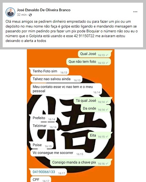 Tem golpista se passando por prefeito de Altamira do Paraná para pedir dinheiro emprestado.
