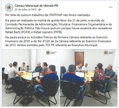 A Comissão Permanente da Administração Tributária, Financeira e Orçamentária e da Administração Pública da Câmara de Ubiratã iria se reunir na semana passada. Iria. Só que dois vereadores faltaram e não deu quórum. A pauta incluia parecer do Tribunal de Contas do Estado sobre as contas da prefeitura de 2013 e 2018. Detalhe: a própria Câmara divulgou pelas redes sociais que a reunião não aconteceu...