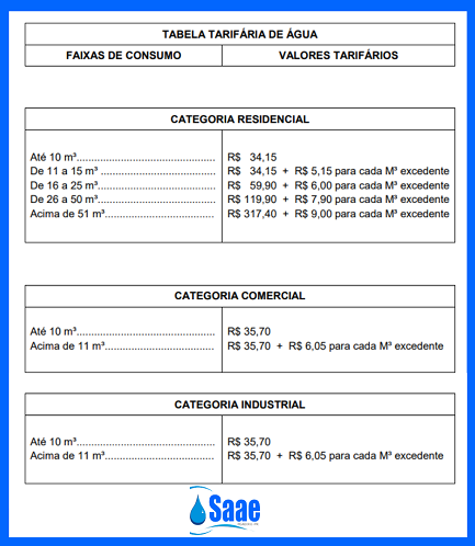 Os novos valores da água em Peabiru estão na tabela acima.