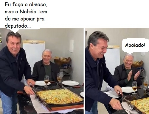 O deputado Márcio Nunes segue com a série de vídeo "No domingo, o cozinheiro sou eu". Nesta semana o prato foi "peixe à Maripá". Detalhe: com o ex-prefeito Nelson Tureck (Campo Mourão e Luiziana) de convidado especial. Tureck vai apoiar a reeleição de Nunes. A vice-prefeita Fátima Nunes, pré-candidata a deputada federal, e o vereador Olivino Custódio também participaram do almoço.