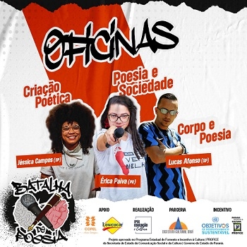 O projeto "Batalha de Poesias" está de volta. Serão três oficinas presencias este mês em Campo Mourão. O objetivo é instruir jovens acima de 15 anos a lerem, criarem textos poéticos e se apresentarem em slams (campeonatos de poesia falada). Tudo gratuito. Onde se inscrever? https://tinyurl.com/bdfdb3dk
