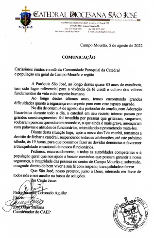 "Pedimos, encaredicamente, a todas as autoridades competentes e à população geral que nos ajudem a buscar caminhos que possam garantir a nossa segurança, a integridade das pessoas no centro de Campo Mourão e, sobretudo, o sagrado direito de vem viver a sua fé com respeito, tranquilidade e fervor".