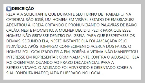 O caso da invasão na Catedral São José, em Campo Mourão, na quinta-feira, está registrado no Boletim de Ocorrências do 11° BPM. Diz que o invasor era um homem "em visível estado de embriaguez" e que chegou a ser localizado pela PM. "Porém, a vítima não manifestou interesse em representar criminalmente", destaca o texto. A vítima, no caso, é uma mulher que trabalha na Catedral (veja acima na íntegra).