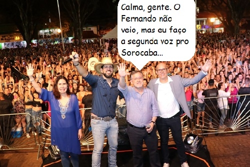 O cantor Sorocaba fez show sozinho nesta segunda-feira em Campo Mourão. Foi a atração principal na comemoração dos 75 anos do município. E o Fernando? O companheiro de Sorocaba teve problemas no voo que saiu de São Paulo, devido ao mau tempo, e não chegou a tempo. Durante o dia, ele participou de evento com o presidente Jair Bolsonaro, em Brasília.