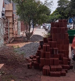 Materiais de construção impedem a passagem de pedestres na av. Irmãos Pereira, no centro de Campo Mourão.