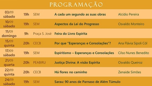 Começa neste sábado, em Campo Mourão, a 15ª edição do Mês Espírita. A programação segue até o próximo dia 24 e inclui palestras, feira do livro e sarau. Por que setembro? Por que é o mês de fundação das duas casas espíritas da cidade. O Centro Espírita Caminheiros do Bem completa 57 anos e a Sociedade Espírita Meimei, 38.