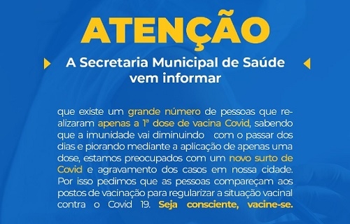 A Secretaria de Saúde pede que as pessoas compareçam aos postos de saúde para regularizar a vacinação contra a covid.