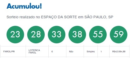 Ninguém acertou as seis dezenas da Mega Sena sorteadas neste sábado. Assim, o prêmio de R$ 125 milhões ficou acumulado para o próximo sorteio, que deverá chegar a R$ 150 milhões. Na região, de novo, teve apostador que passou raspando. Das 189 apostas em todo o País que fizeram a quina, uma delas foi feita em Farol. O prêmio para o "sortudo/azarado" é de R$ 42 mil.