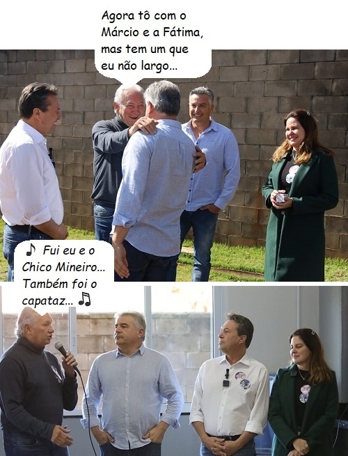 Os cliques são da campanha eleitoral em Campo Mourão. O deputado estadual Márcio Nunes disputa a reeleição e, na cidade, faz dobradinha com a esposa, a vice-prefeita Fátima Nunes (federal). Os dois têm o apoio do ex-prefeito Nelson Tureck. Showmício não pode, mas se precisar de alguém pra cantar o "Chico Mineiro"...