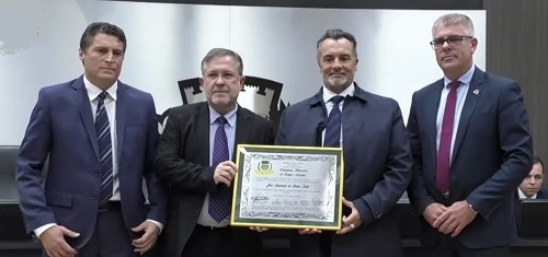 A Câmara de Campo Mourão entregou nesta quarta-feira o título de Cidadão Honorário ao presidente do Tribunal de Justiça do Paraná, desembargador José Laurindo de Souza Netto. A entrega foi feita pelos dois vereadores que propuseram a homenagem - Edilson Martins e Bina Teixeira - e pelo prefeito Tauillo Tezelli.