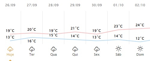 Chove em Campo Mourão nesta segunda-feira. E vai continuar chovendo durante a semana toda. É o que diz a previsão do Simepar. Dia de sol, sem chuva, só a partir de sábado. Na quinta, a temperatura mínima cai a 13 graus e a máxima vai a 19. Para domingo, dia da eleição, o Simepar diz que fará sol, com temperatura variando de 12 a 24 graus. O Climatempo também prevê chuvas até sexta-feira.