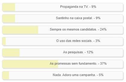 Enquete com esta pergunta foi encerrada neste domingo e deu vitória à alternativa "As promessas sem fundamento". Teve 37% dos votos. "Sempre os mesmos candidatos" ficou em segundo, com 24%, seguido de "As pesquisas", com 12%. Só 5% foram na opção "Nada. Adoro uma campanha". O resultado completo está no quadro acima.