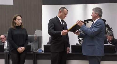 A Câmara de Campo Mourão realizou sessão solene nesta quinta-feira. Foi para a entrega da Comenda 10 de Outubro à Loja Maçônica Fraternidade Mourãoense. O vereador autor, Paulo Pilatte, fez a entrega a Ériton Toledo Arcarin, junto com a procuradora geral do município, Alessandra Chiroli. No discurso, Pilatte destacou a ação da loja maçônica na Casa de Apoio aos Doentes de Câncer. Sete vereadores participaram da sessão.