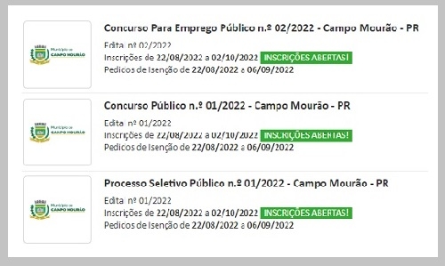 Tem mais - Outros dois concursos foram abertos pela prefeitura de Campo Mourão com as mesmas datas. Um é no regime celetista, com sete vagas na área de saúde em cinco cargos. O terceiro é de emprego público, com três vagas para agentes de endemias.