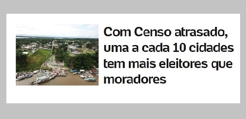 O portal UOL destaca nesta segunda-feira que, devido ao atraso no Censo, uma em cada 10 cidades brasileiras tem mais eleitores que moradores nos dados oficiais. As informações são do colunista Carlos Madeiro (veja na íntegra https://tinyurl.com/5n7ytra3)