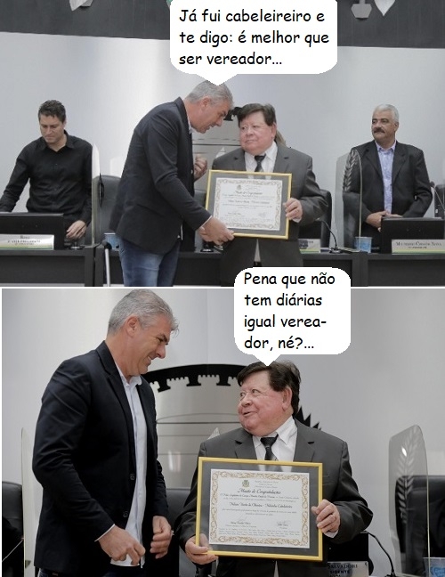 Os cliques são desta segunda-feira, quando Nelson Bento de Oliveira, o Nelsinho Cabeleireiro, recebeu moção da Câmara de Campo Mourão. A entrega foi feita pelo co-autor da homeangem, o vereador Edilson Martins, que trabalhou como cabeleireiro antes de entrar na política. Portanto, foi de cabeleireiro para cabeleireiro...