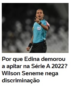 Olha a árbitra Édina Batista, de Goioerê, outra vez em destaque nacional. Agora foi no portal UOL, com chamada na página inicial e tudo. No texto, o chefe da comissão de arbitragem da CBF, Wilson Seneme, nega discriminação no fato dela demorar a voltar a apitar jogos da Série A.