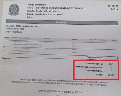 A Justiça Eleitoral de Campo Mourão realizou neste sábado à tarde a cerimônia de emissão da zerésima do sistema de totalização da Zona Eleitoral. Participaram juiz, promotor, chefe de cartório eleitoral e representante da OAB. O extrato comprova que não há votos totalizados antes da votação. Neste domingo, antes que se comece a votar, também é emitida a zerésima de cada urna.