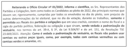 "(...) os fiscais não podem usar camisas ou outras peças iguais, como, por exemplo, todos com camisas vermelhas ou com camisas verde e amarelas", destaca o ofício.