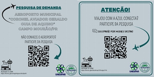 E aí, já viajou na linha área Campo Mourão-Curitiba? Se viajou ou não, você pode ajudar numa pesquisa sobre a demanda potencial e real do aeroporto de Campo Mourão. Trata-se de um trabalho de um estudante de turismo e meio ambiente da Unespar. O objetivo é ajudar no desenvolvimento turístico do município. A pesquisa é rápida, anônima e sigilosa.