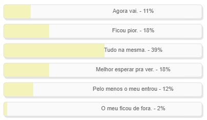 "O que você achou dos deputados eleitos este ano?" Enquete encerrada neste domingo deu vitória à alternativa "Tudo na mesma", com 39% dos votos. "Melhor esperar para ver" e "ficou pior" empataram na segunda posição, com 18%. "Pelo menos o meu entrou" teve 12%. O resultado completo está no quadro acima.
