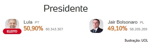 Lula venceu Bolsonaro por 6 votinhos - 1.683 a 1.677 (50,09% a 49,91%).