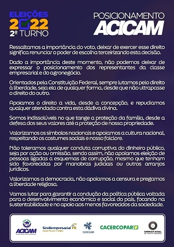 A Acicam divulgou neste sábado seu "posicionamento" com relação ao segundo turno da eleição presidencial. O texto também é assinado por Sindiempresarial, Codecam, Cacercopar e Sindicato Rural de Campo Mourão. O documento não cita nomes de candidatos, apenas traz "princípios" que as entidades defendem. Agora, repare na logomarca das eleições que foi usada...