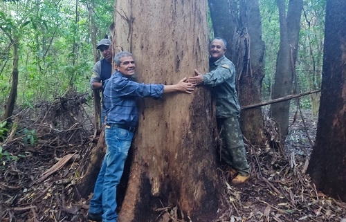 O vice-prefeito de Janiópolis, Eides Guedes, e o presidente da Câmara, Elias Veloso, além do Marcão Sobczak, tiveram de se unir para abraçar o tronco de um pé de eucalipto no município. A árvore, que tem mais de 50 anos, está no trajeto da Caminhada Internacional na Naturez que acontece neste domingo em Janiópolis.