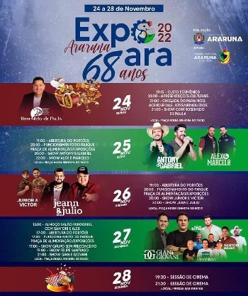 A prefeitura de Araruna divulgou nesta segunda-feira a programação da Expoara. O evento será realizado de 24 a 28 de novembro em comemoração ao 68° aniversário do município. Haverá shows musicais todos os dias, além de praça de alimentação e parque de diversões. Entre as atrações estão as duplas Antony & Gabriel (dia 25), Jeann & Julio (26) e Gian & Giovani (27). A abertura inclui a chegada do Papai Noel e o encerramento, sessões de cinema.