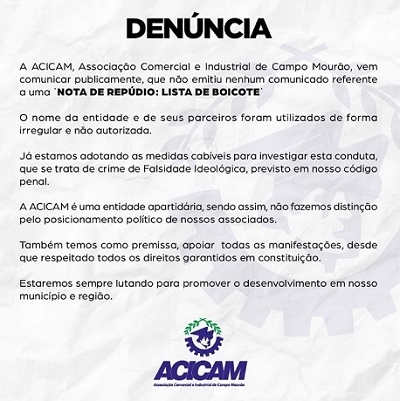 Viu pelas redes sociais uma "nota de repúdio" da Acicam e outras entidades de Campo Mourão, com relação a uma lista de boicote a empresas pelo apoio a um ou outro candidato a presidente do Brasil? É "fake". A associação comercial usou as redes sociais neste sábado à noite para publicar uma "denúncia". Diz que não emitiu nenhum comunicado neste sentido e que já está tomando as medidas cabíveis.