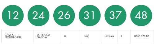 Uma aposta simples feita no Guarujá/SP acertou sozinha as seis dezenas da Mega Sena sorteadas nesta quarta-feira. Faturou R$ 64,2 milhões. Campo Mourão, mais uma vez, passou raspando. Uma aposta feita na lotérica Garcia foi uma das 94 que fizeram a quina (cinco das seis dezenas) e garantiu um prêmio de R$ 55,8 mil.