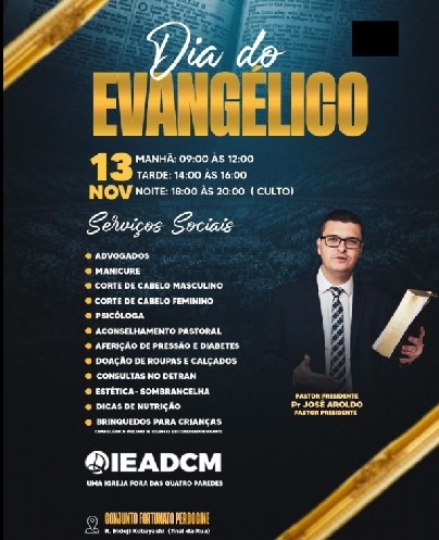 Você sabia que o segundo sábado de novembro é Dia Municipal do Evangélico em Campo Mourão? A comemoração este ano acontece neste domingo, no conjunto Fortunato Perdoncini, com uma série de ações durnate o dia (veja no quadro acima) e culto à noite. A lei municipal existe desde 2013. O projeto partiu do vereador Edilson Martins, que é membro da Assembleia de Deus.