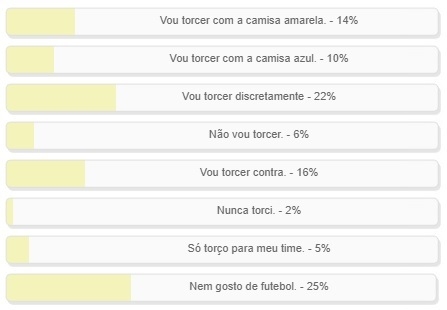 "Na Copa do Mundo deste ano, como será sua torcida pelo Brasil?" Enquete com esta pergunta foi encerrada neste domingo. Surpresa! Venceu a alternativa "Nem gosto de futebol", com 25% dos votos. Depois veio "Vou torcer discretamente", com 22% e, pasmem, "Vou torcer contra", com 16%. O resultado completo está no quadro acima.
