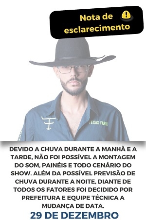A 12ª Cavalgada Cultural de Moreira Sales aconteceu neste domingo, com chuva e tudo. Mas o show nacional com Luan Pereira, que aconteceria à noite em praça pública, não deu, não. Uma "Nota de esclareimento" diz que não foi possível montar os equipamentos. Além de quê, havia previa de chuva na hora da apresentação também. Assim, o show foi remarcado para outra data - 29 de dezembro.