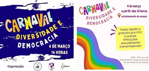 Tem carnaval neste sábado em Campo Mourão. É o Carnaval da Diiverdade e da Democracia organizado pelos coletivos LGBTQIAPN+, Negro e Feminista, em parceria com a Casa Terra Coletiva. Começa às 14h e vai até às 20h, no estacionamento da Unespar. Haverá exposições de artes, batalha de rap, música, venda de arte indígena, testes de saúde e arrecadação de alimentos não-perecíveis, entre outros.