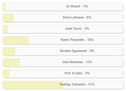 "Quem já foi candidato a prefeito de Campo Mourão e que deveria tentar de novo em 2024?" Enquete encerrada neste domingo deu vitória ao ex-vice-prefeito Rodrigo Salvadori, com 41% dos votos. Ele foi candidato nas duas úlitmas eleições. Namir Piacentini, que disputa a eleição há 35 anos (1988), ficou em segundo, com 18%. Osni Menezes, que concorreu em 2004, completou o pódio, com 12%. O resultado completo está no quadro acima.