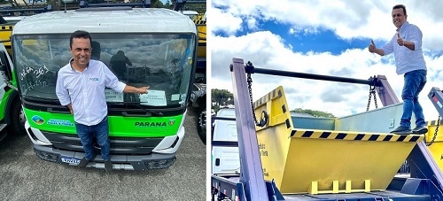 Lembra que o governo do Estado entregou durante a semana 165 caminhões para 132 prefeituras? Um deles - poliguindaste - foi para Goioerê. O prefeito Betinho Lima foi buscá-lo e na hora das fotos inovou nas poses. Teve clic sobre o para-choques e se equilibrando sobre a caçamba, entre outros.
