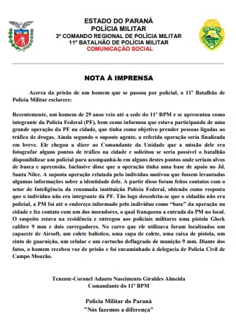 O 11° BPM divulgou uma nota sobre o caso. Diz que o homem foi preso com uma pistola 9 mm e dois carregadores. No carro dele, havia itens como colete balístico, caixa de pistola e cinto de guarnição, entre outros.