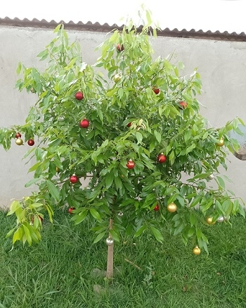 Árvore da calçada pública com enfeites de Natal, na av. Armelindo Tromboni.