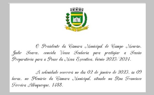 Será no próximo dia 2, às 9h, a sessão de posse da nova mesa diretora da Câmara de Campo Mourão.