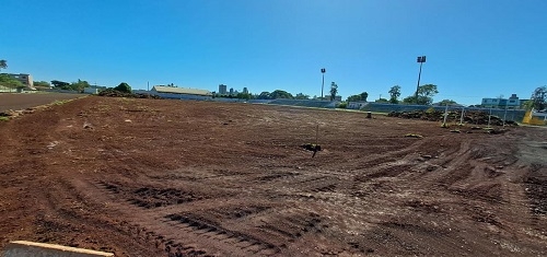 Sim. A foto é do estádio municipal Roberto Brzezinski, em Campo Mourão. Mas calma. A retirada do gramado faz parte da instalação da nova pista de atletismo. É que o terreno precisa ser nivelado. Um novo gramado será plantado no local. A construção da pista envolve um contrato de R$ 2,3 milhões.