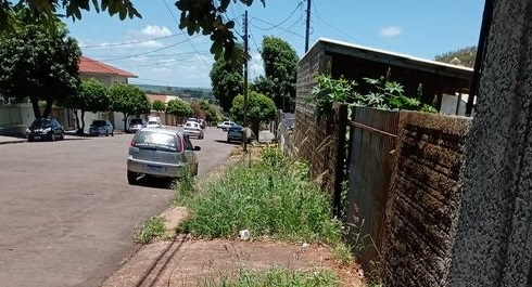 Calçada tomada pelo mato na rua São José, centro de Campo Mourão.