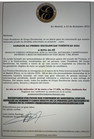 A Rota da Fé, de Campo Mourão, vai receber o prêmio Excelências Turísticas 2022, o oferecido pelo grupo Excelencias, da Espanha. O anúncio foi feito pelo presidente do grupo, José Carlos Santiago. A entrega será no próximo dia 18, durante a Feira Internacional de Turismo de Madri. Criada em 2007, a Rota da Fé já teve 61 edições realizadas.