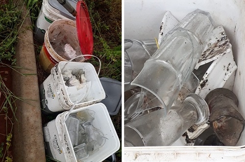 Alguém abandonou na av. Dr. Eugênio Kapezak, residencial Parque do Lago, quatro baldes de margarina com copos, taças e pratos quebrados. Destinação incorreta. Será que irá retirar?